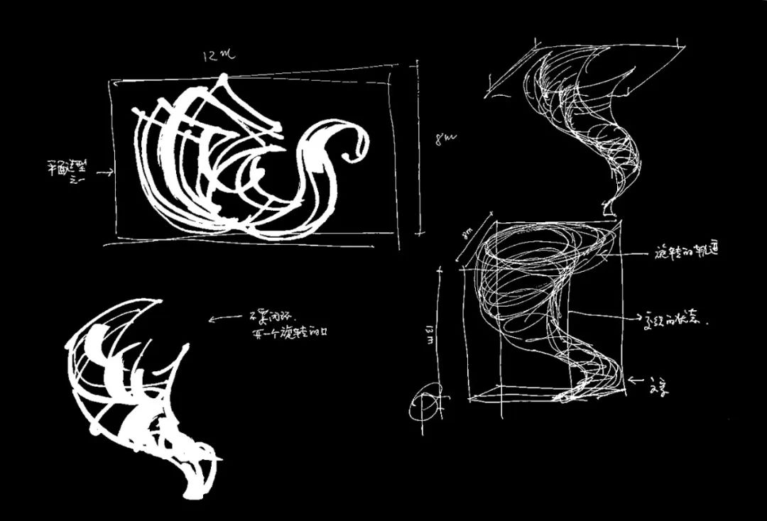 装置的形态灵感来源于大海上的风暴,但将风暴的形态抽象成了螺旋式上升的信息流碎片,通过向心力汇聚同时表现了多种对立矛盾的关系:混乱与秩序、模糊与肯定、理性与感性、分散与聚合……细看信息流的内容,是从混沌的、不可辨识的几何形态,到秩序的、有规律的符号,再到可读的、能表达准确含义的文字,最后演变为世界语境下的各种语言文字。通过如此由简及繁的形态而产生的动势,来动态地表达文明的启迪和科技发展带来的扩散效应。